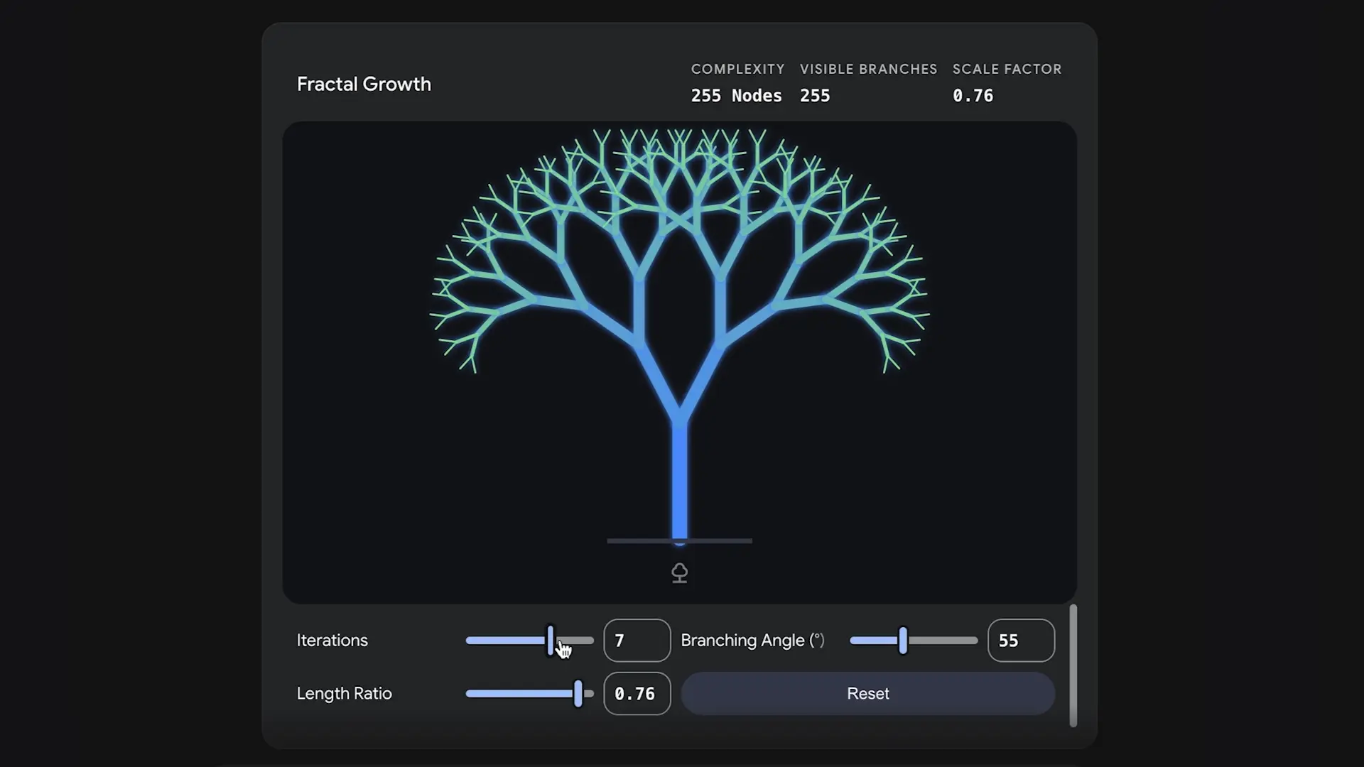 要使用这一新功能,Google建议用户在提问时以“Show me(展示给我)”或“Help me visualize(帮我可视化)”这样的语句开头,并确保在 Gemini 中选择“Pro”模型,以调用相关能力。 例如,输入“Visualize how fractals work(可视化分形是如何运作的)”时,Gemini 会生成分形生长的动态图像,用户可以调整分支角度、长度比例和迭代次数等参数,观察分形形态的变化。