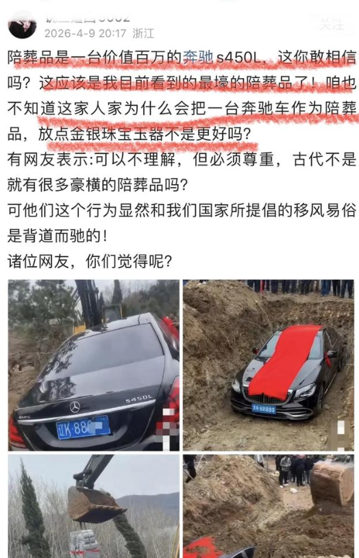 近日,辽宁辽阳有家属疑似将价值百万的奔驰S450L作为陪葬品,引发舆论哗然。相关视频画面中,一台挖掘机正吊起一辆黑色轿车,在众人配合下将车辆推入提前挖好的墓坑,随后直接覆土掩埋。现场可见崭新墓碑旁立有石柱,涉事车辆为黑色奔驰 S450L,悬挂辽宁牌照,尾号含 “8888”,车顶还覆盖着红布。