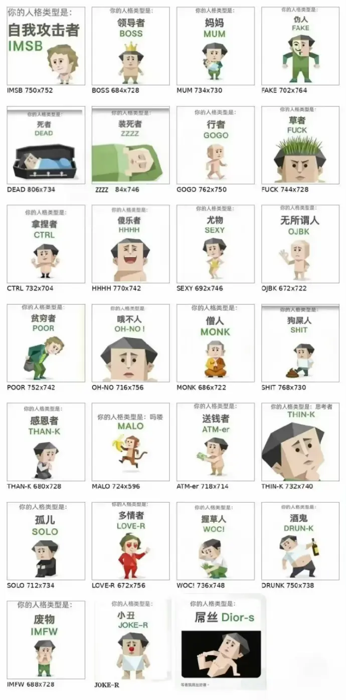 那什么是SBTI呢?它是社区对经典MBTI人格测试的解构、玩梗和改编。全称为Silly Big Personality Test,直译过来就是 “傻大人格测试”。
