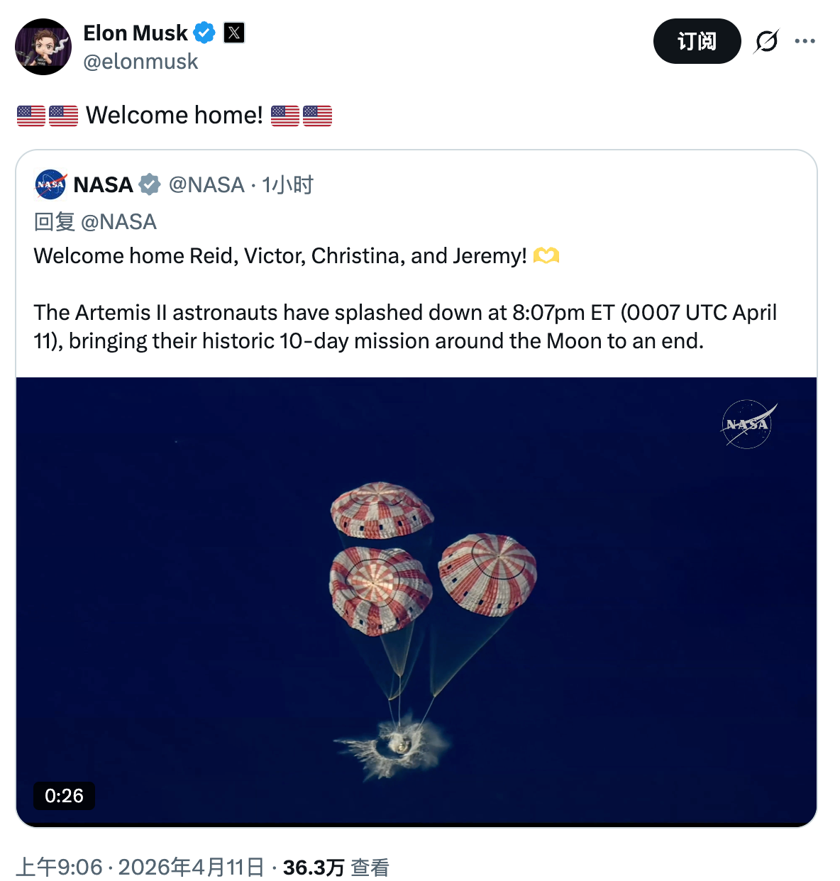 4月11日,当地时间周五,美国宇航局(NASA)的“阿尔忒弥斯二号”探月飞船成功返回地球,完成了10天的绕月飞行之旅。SpaceX CEO埃隆·马斯克(Elon Musk)也在社交媒体上表示了祝贺。