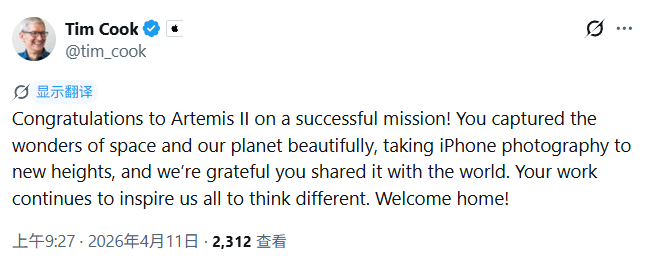 NASA阿尔忒弥斯2号“猎户座”飞船在加利福尼亚州圣迭戈海岸附近太平洋海域成功溅落,标志着美国首次载人绕月任务圆满成功。苹果CEO蒂姆・库克发文,祝贺NASA阿耳忒弥斯2号载人绕月任务圆满成功。