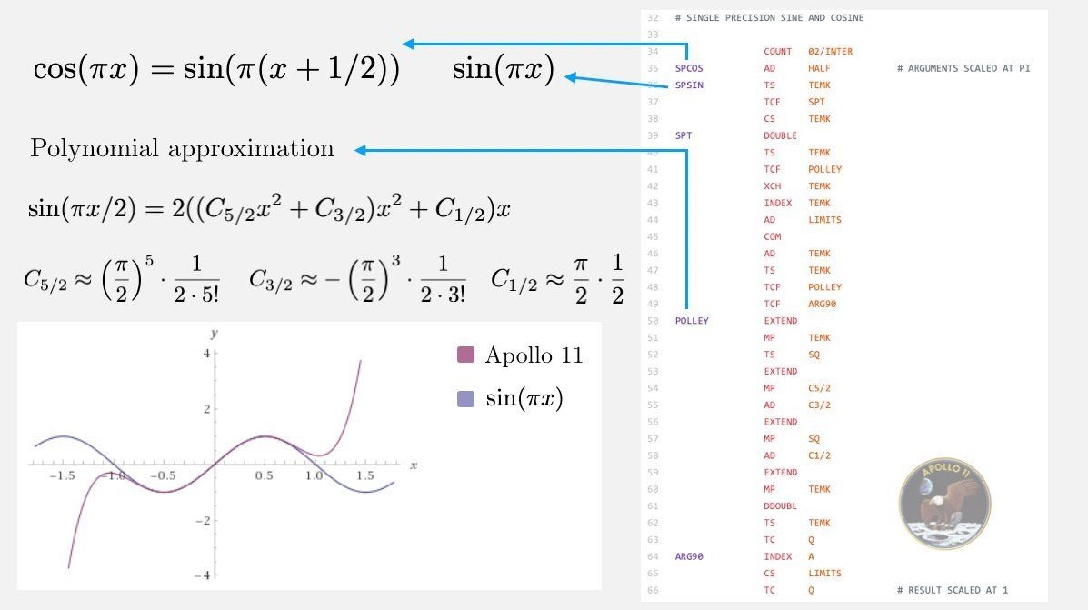 网上还流传着另一段精彩的代码示例,来自阿波罗11号导航轨迹计算程序,其中包括最为关键的30行汇编代码,主要是计算正弦、余弦等超越函数。