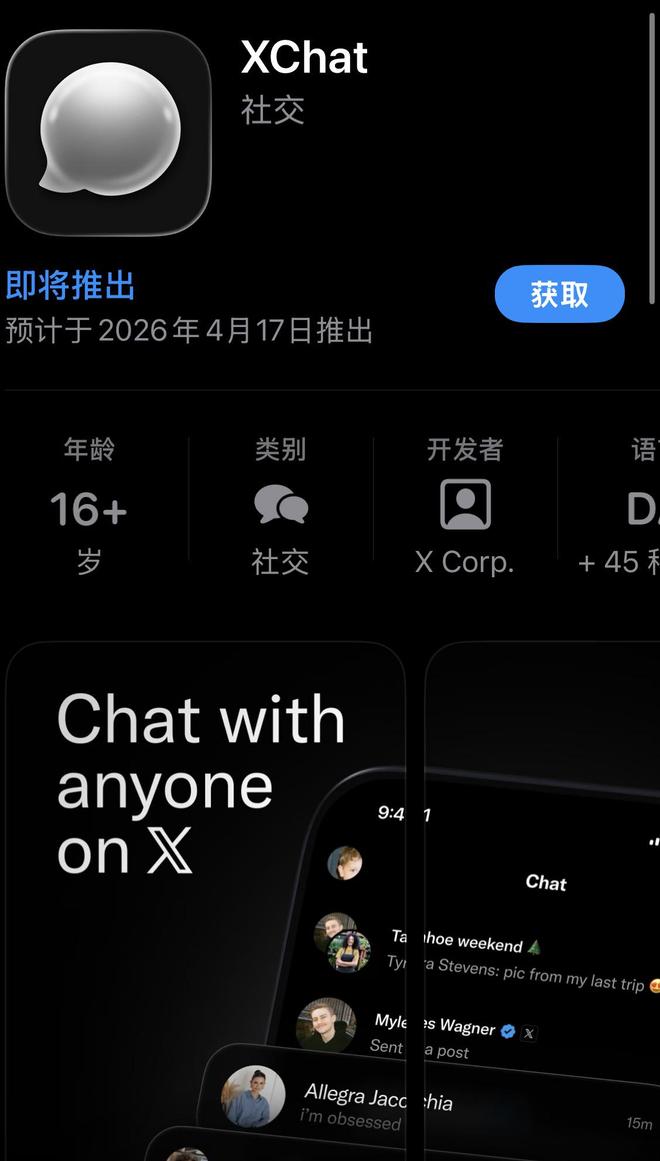 马斯克酝酿三年的超级App野心,终于从构想落地为产品。4月11日,马斯克旗下X平台正式宣布,独立加密通讯应用XChat将于4月17日登陆苹果App Store,面向全球用户开放下载。