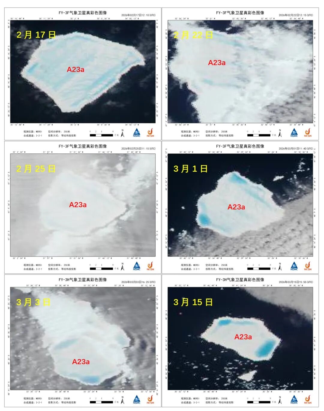 国家卫星气象中心(国家空间天气监测预警中心)国际用户服务中心基于风云气象卫星等遥感资料,长期追踪监测A23a的移动轨迹、形态变化与崩解过程。