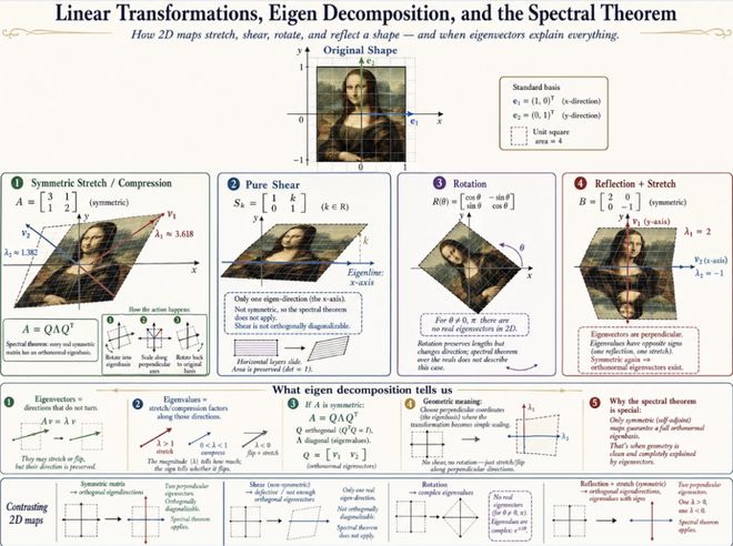 @doodlestein 测试GPT Image 2用同一个提示词画一张线性代数解释图。模型一口气画出4个完全不同的版本:同样是Mona Lisa+特征向量教学,每个版本的构图、配色、信息密度完全不同。