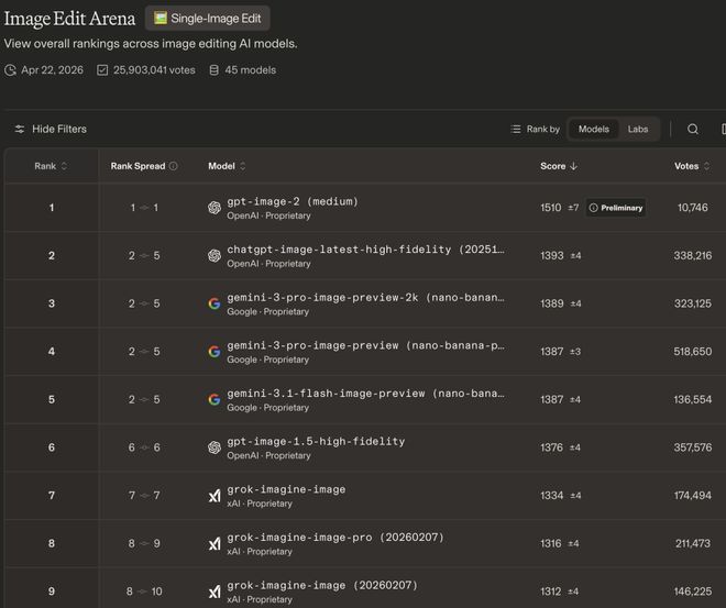 Arena.AI单图编辑榜(Image Edit Arena):GPT Image 2 (medium) 仍以1510+分继续登顶,第二、三、四、五名全部被OpenAI自家模型和Google Gemini系列占据。https://arena.ai/leaderboard/image-edit