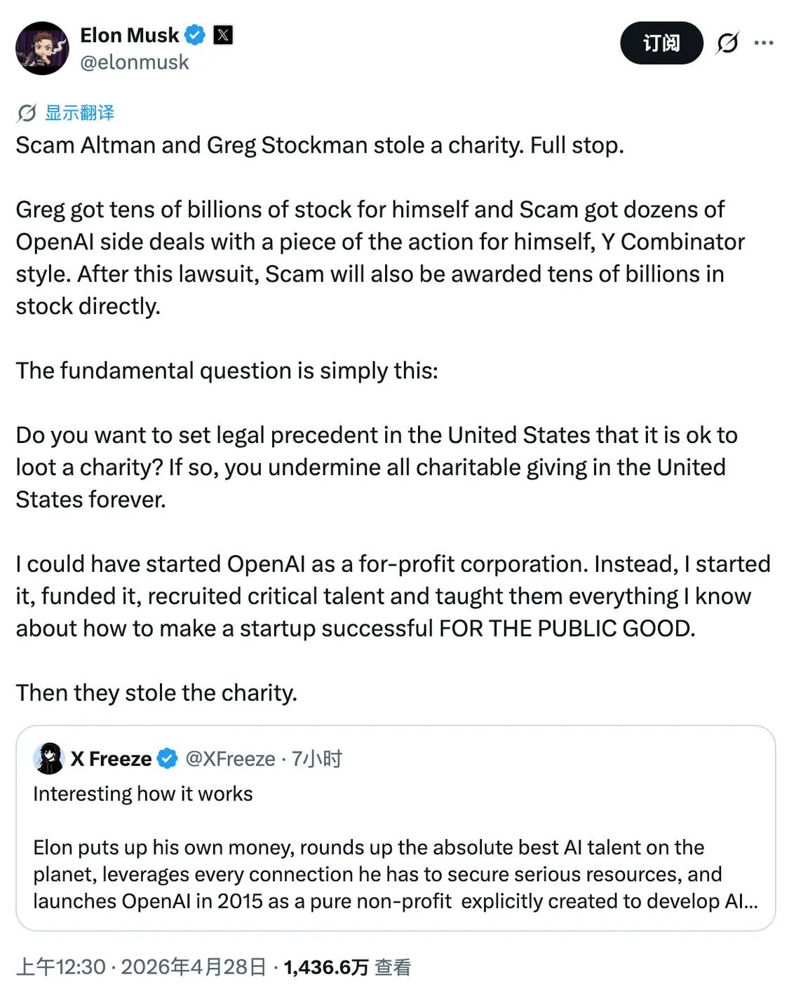 “骗子·奥特曼和格雷格·斯托克曼偷走了一家慈善机构。就这么简单。格雷格给自己拿到了价值数百亿美元的股票,而骗子·奥特曼则使用Y Combinator那套模式,通过OpenAI的数十项关联交易,为自己分得利益。这场官司打完,骗子自己还将直接获得数百亿美元的股票奖励。”马斯克表示。